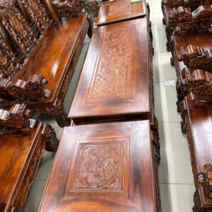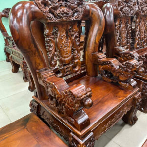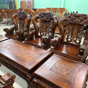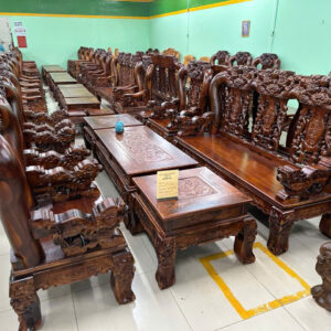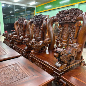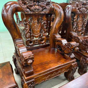 -Bộ bàn ghế nghê dỉnh tay 16 gỗ muồng (cẩm lai nam phi, lim xet, lim đen… ). Mẫu nghê đỉnh này được đục tay Rồng tạo thêm sự mạnh mẽ cho ghế.