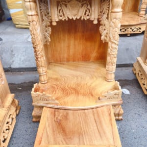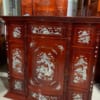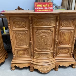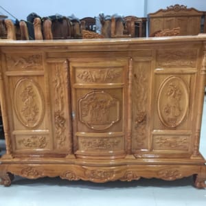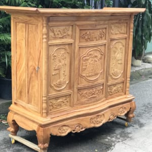 Mặt tủ chạm hình ảnh Phúc- Lộc – Thọ mang ý nghĩa cát lộc- cát tường. Hai bên tạo hình của đôi hạc chầu trên mai rùa. Hạc đứng trên mai rùa thể hiện sự kết hợp hài hòa giữa đất và trời, giữa âm và dương. Hạc thường xuất hiện bên các vị thần tiên và là biểu tượng của sự trường thọ. Rùa là linh vật trong tứ linh là biểu tượng của sự trường tồn, vĩnh cửu. Hạc đứng trên mai rùa biểu thị sự khát vọng trường tồn của người Việt.Bốn góc mặt chạm tứ linh (long, lân, quy, phụng)
